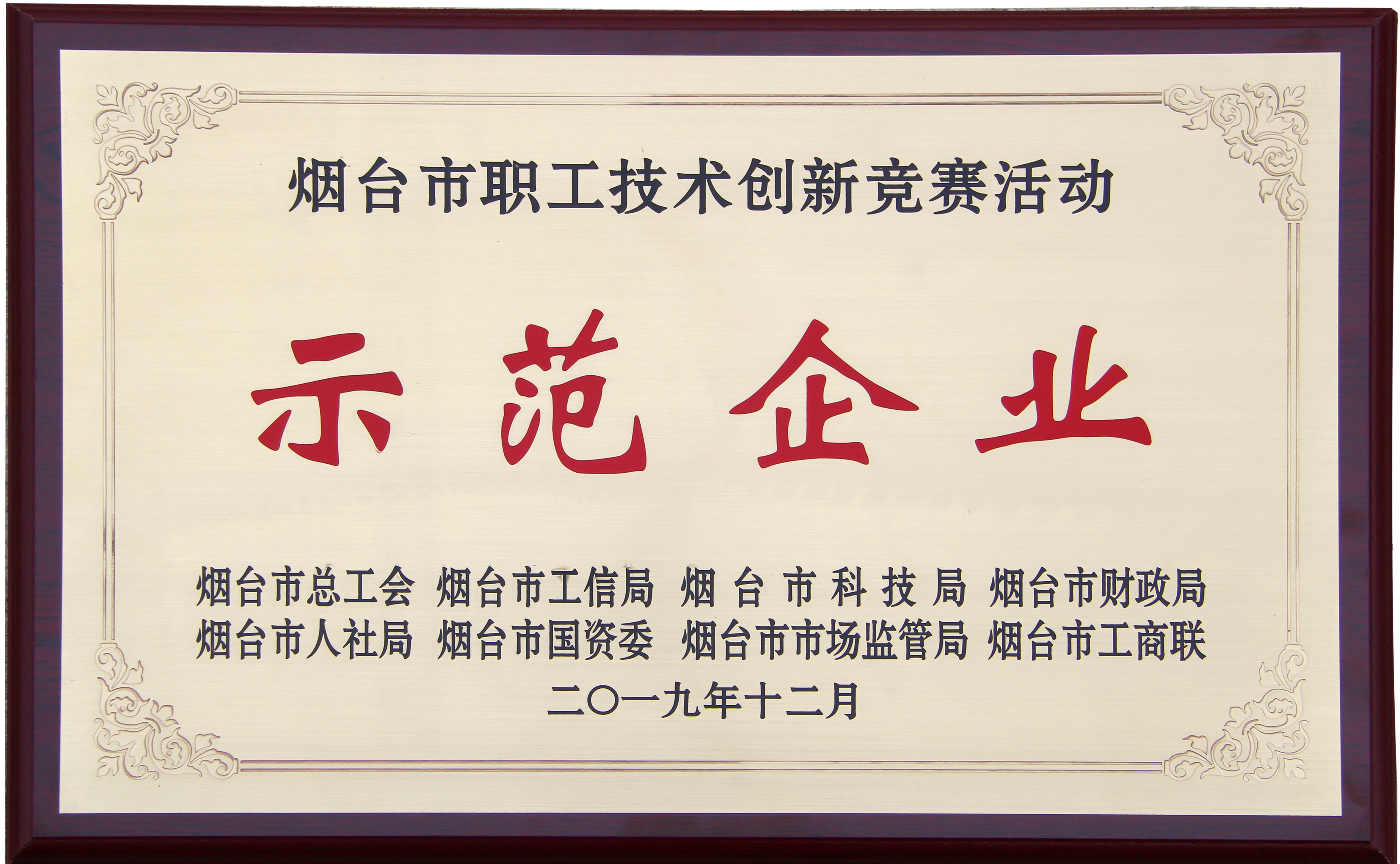 ★ 2019年被煙臺市總工會、市工信局、市科技局、市財政局、市人社局、市國資委、市市場監管局、市工商聯八個 部門聯合授予《煙臺市職工技術創新競賽活動示范企業》;同時被授予《煙臺市五一勞動獎狀》;
